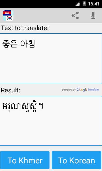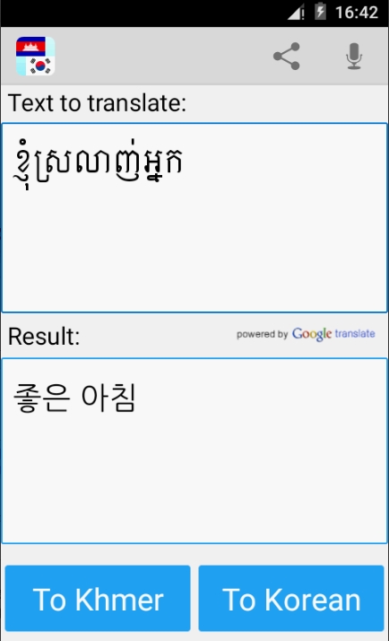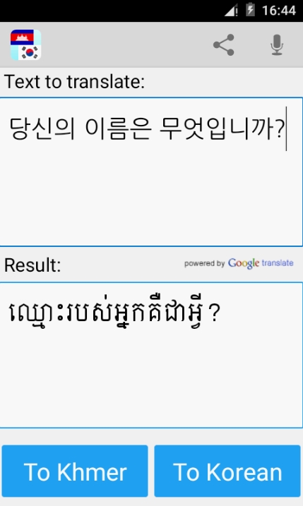 크메르어 한국어 번역기 어플은 크메르어에서 한국어로 그리고 한국어에서 크메르어로 단어와 문장을 번역할 수 있습니다. 쉽고 바르게 번역해주며 사전처럼 이용하실 수가 있습니다. 적기 귀찮으시면 음성으로 입력해서 번역하실 수도 있습니다. 번역된 결과를 연락처에 있는 친구에게 공유하실 수도 있습니다. 크메르어를 학습하시는 학생, 캄보디아 여행자, 캄보디아 출장 가시는 분 등에게 매우 유용한 어플입니다.
