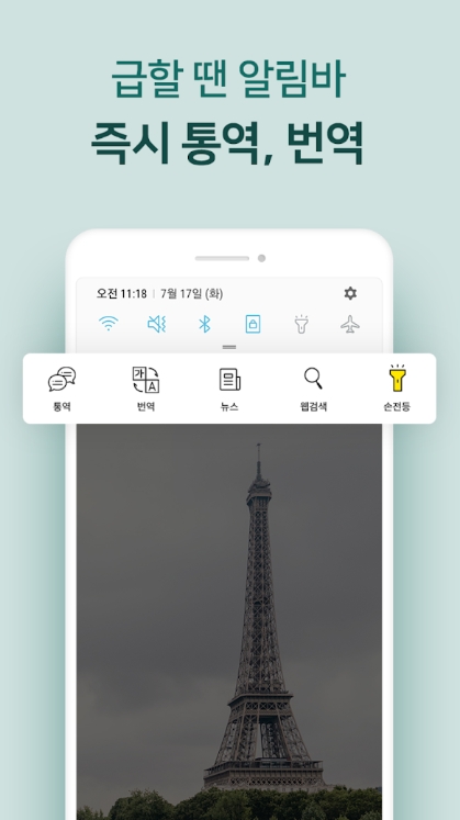 번역, 통역, 음성인식, 외에도 키보드, 알림바, 뉴스, 검색, 손전등까지!! ALL IN ONE 번역기는 말하는 번역기입니다. 알림바 기능으로 스윽~ 한 번이면 번역, 통역이 나타납니다.